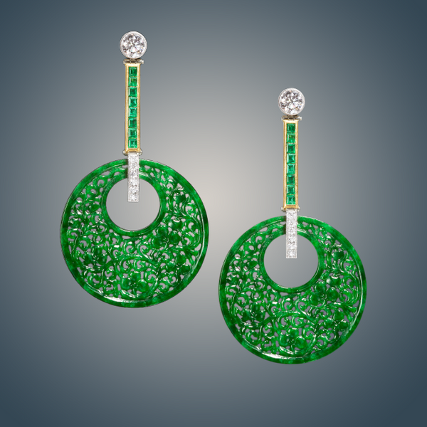 Elevate your ensemble with our Green Jade Emerald & Diamond Earrings. They showcase lush green hand-carved jade paired with vibrant emeralds and diamonds. These earrings symbolize the eternity of life and bring freshness and vitality to any outfit. These large jade earrings will turn heads and spark conversation, whether worn for a special occasion or as a daily reminder of nature's beauty.