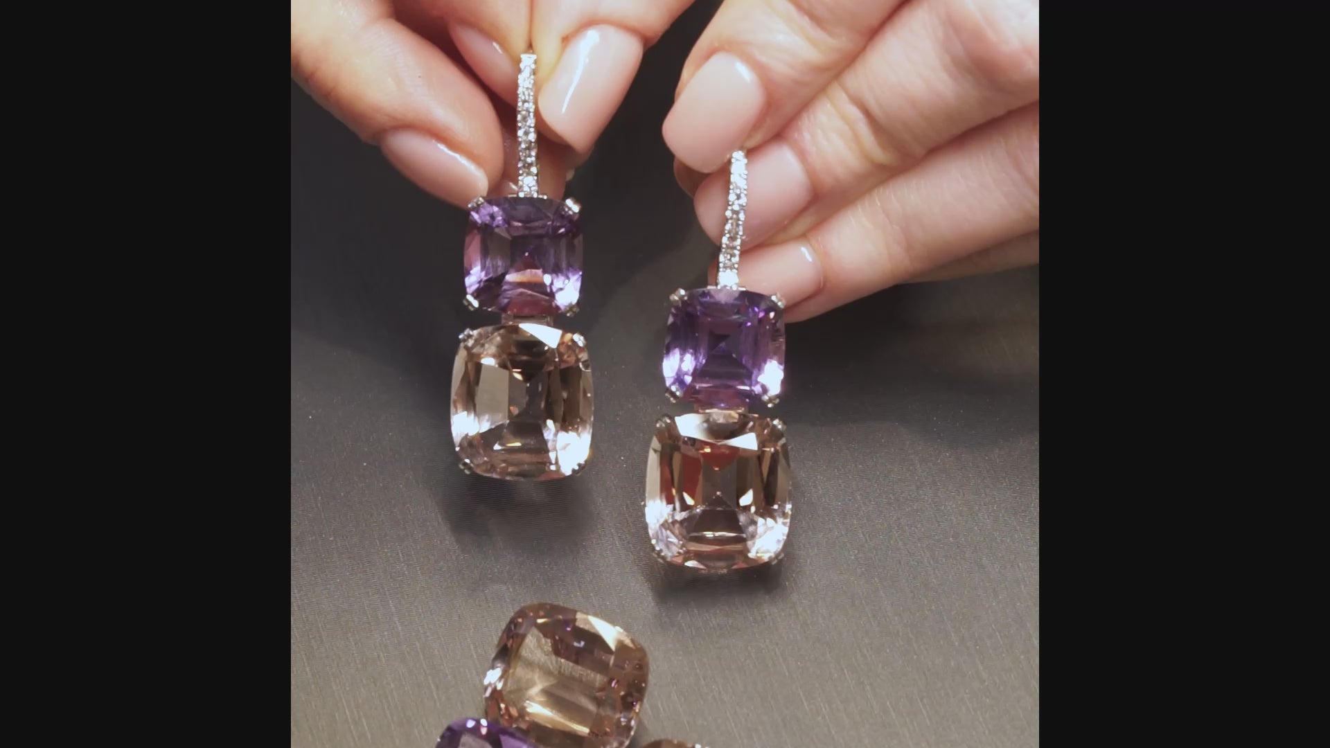 These earrings unfold like a study in chromatic seduction, crafted for those who treat jewelry as both art and attitude. At the top, cushion-cut amethysts glow with a velvety, night-orchid intensity—an electrifying purple that feels at once regal and modern. Beneath them, the mood shifts: blush-toned morganites catch the light with a soft, diffused radiance, their champagne-rose warmth adding a whisper of romance to the composition. Suspended from diamond lined hooks in platinum, the design creates a fluid, elongated silhouette that captures the eye with every movement. Sophisticated, feminine, and undeniably glamorous, they offer a refined burst of color worthy of any red-carpet moment. Hand-crafted and one-of-a-kind.