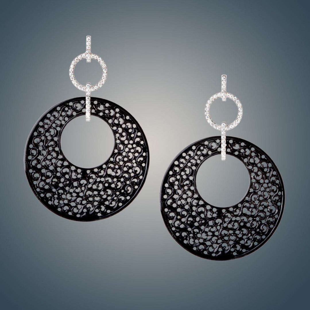 Pair of exquisite untreated Black Jade earrings set in platinum with 80 round brilliant diamonds totaling 1.60 carat. Hand-crafted. One-of-a-kind piece.