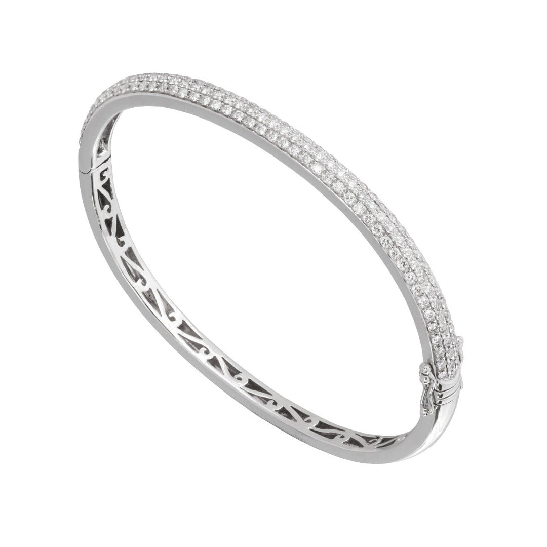 Elegant and classic three row of pave set round brilliant diamonds set in oval shape 18 karat white gold bangle.